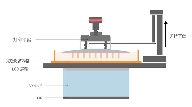 首先,3D模型會(huì)被3D打印軟件橫向地切成一層層,然后投影機(jī)會(huì)把第一層模型的形狀圖案投射到液態(tài)光敏樹(shù)脂上,然后進(jìn)行光固化及成型。第一層完成后,便會(huì)將物件稍微升高,然后投射下一層模型的形狀圖案到光敏樹(shù)脂上,層疊式地打印出模型。