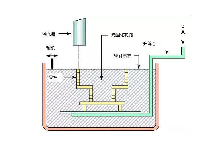首先,根據(jù)CAD設(shè)計(jì)構(gòu)思三維實(shí)體模型,利用離散程序?qū)?shí)體模型進(jìn)行切片處理,設(shè)計(jì)構(gòu)思照射外形,所形成的數(shù)據(jù)信息將對(duì)光源及升降臺(tái)運(yùn)動(dòng)進(jìn)行精確控制;然后,起吊平臺(tái)的相對(duì)距離下落,光固化層覆蓋另一層液體樹(shù)脂后,再照第二層,將第二層牢固粘結(jié)于上一層固化層,逐層堆疊為三維產(chǎn)品原型。其次,激光器根據(jù)切片形狀釋放相對(duì)形狀的光斑,固化樹(shù)脂后完成片層的生產(chǎn)加工;從樹(shù)脂中取出原型,最后固化,再經(jīng)過(guò)拋光、電鍍、噴漆或著色等工序,得到所需產(chǎn)品。